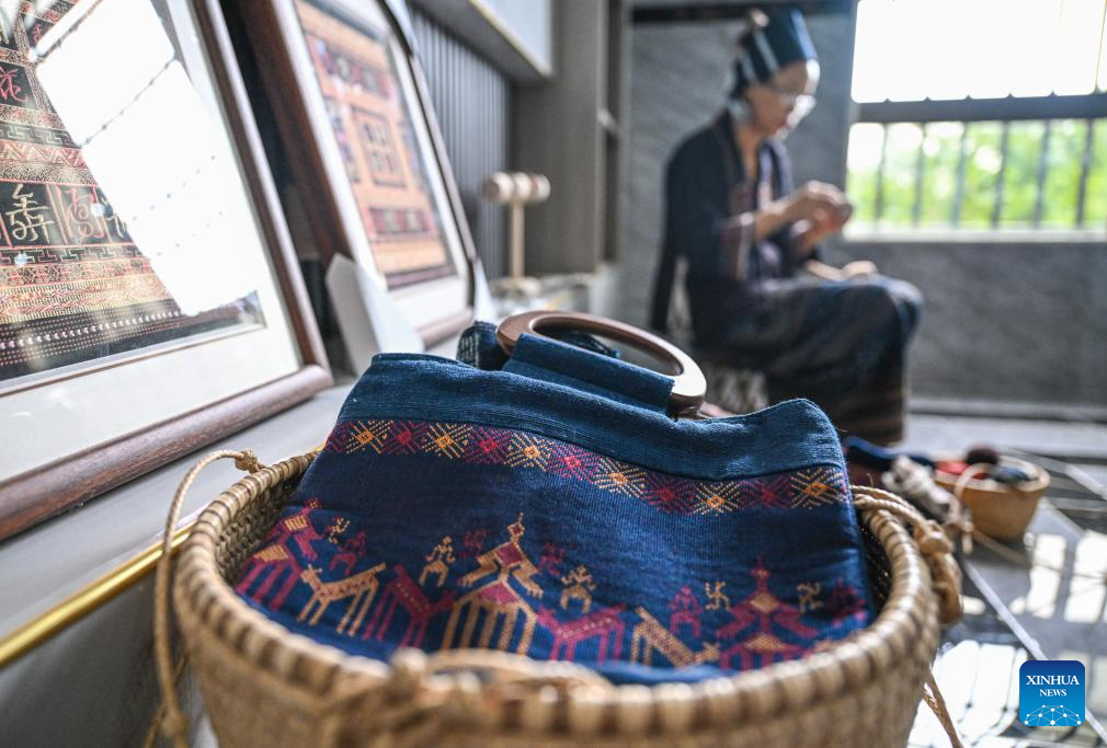 This photo taken on June 7, 2023 shows handbags made from Li textiles by Fu Yongying, a provincial-level inheritor of the traditional Li textile techniques, in Donghe Town of Dongfang City, south China's Hainan Province.?(Xinhua/Pu Xiaoxu)