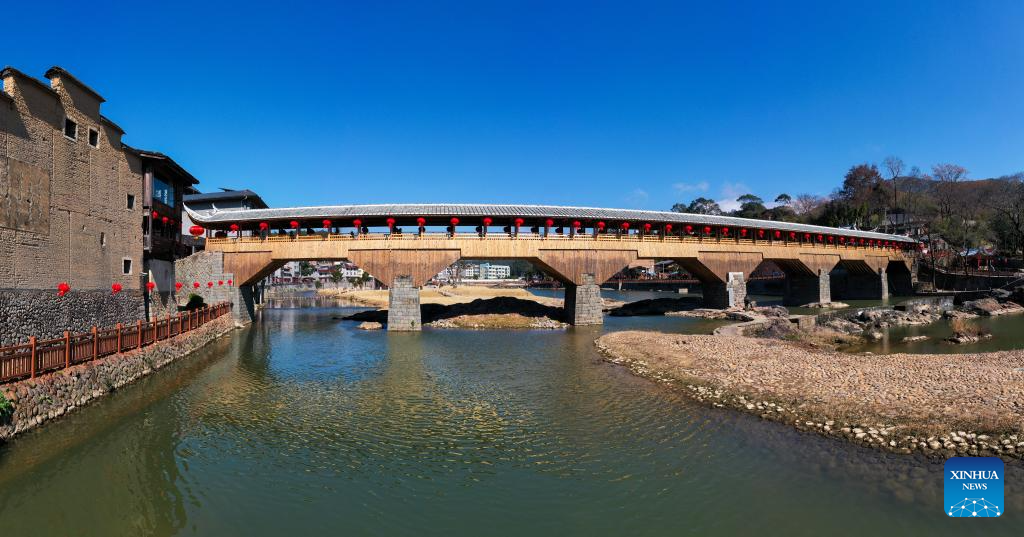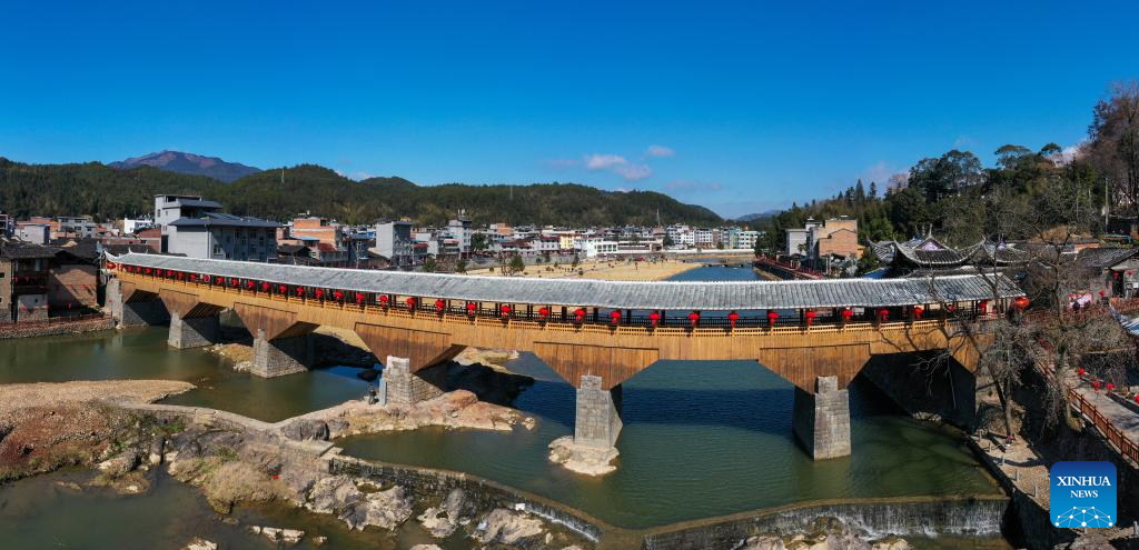 This photo taken on Feb. 21, 2022 shows the Qiancheng Bridge, a wooden arch bridge, in Tangkou Township of Pingnan County, southeast China's Fujian Province.?(Photo by Wang Zhiling/Xinhua)