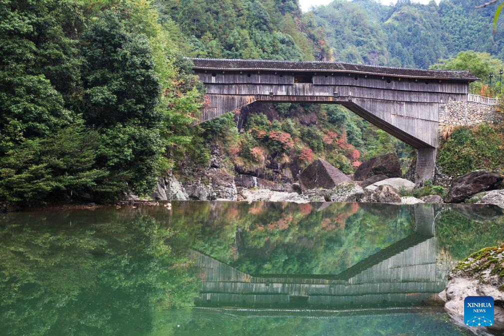 This photo taken on Oct. 1, 2019 shows the Luanfeng Bridge, a wooden arch bridge, in Xiadang Township of Shouning County, southeast China's Fujian Province.?(Photo by Wang Zhiling/Xinhua)