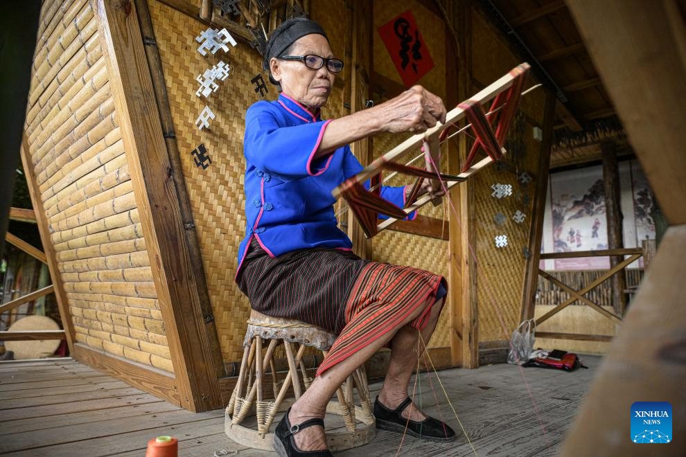 An elderly woman of Li ethnic group demonstrates spinning techniques of Li brocade making at Binglanggu tourism area in Baoting Li and Miao Autonomous County, south China's Hainan Province, Nov. 4, 2024.?(Xinhua/Pu Xiaoxu)