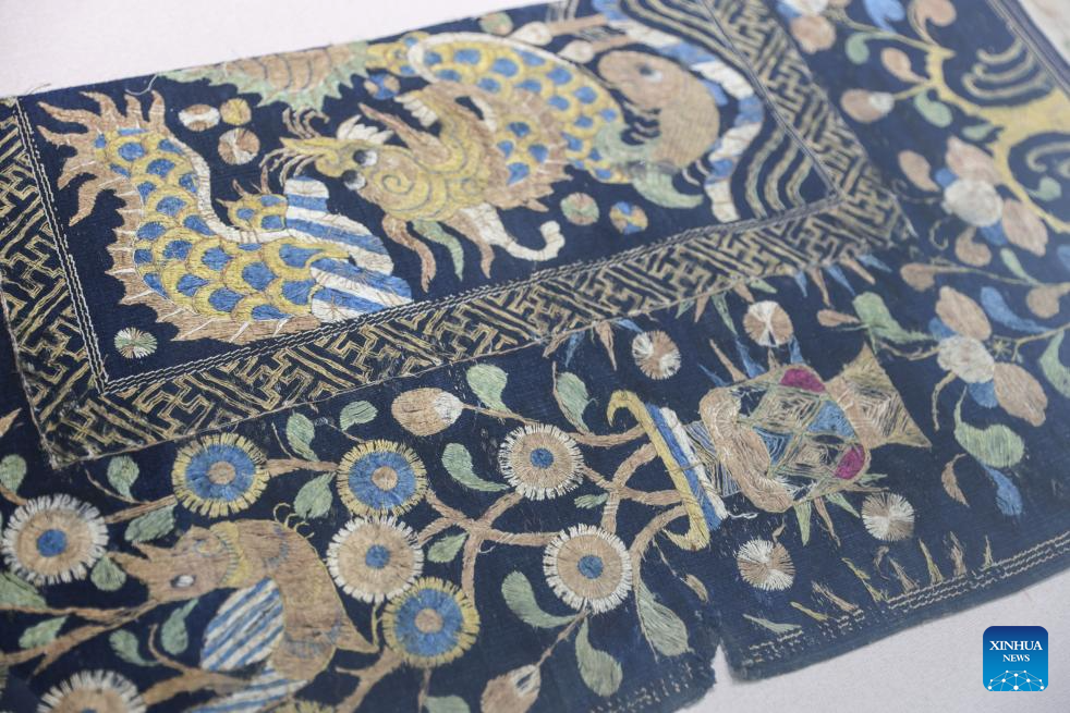 A Li brocade work is displayed during a culture exhibition at a theme park of the Boao Forum for Asia in Boao, south China's Hainan Province, April 20, 2022.?(Xinhua/Zhang Liyun)