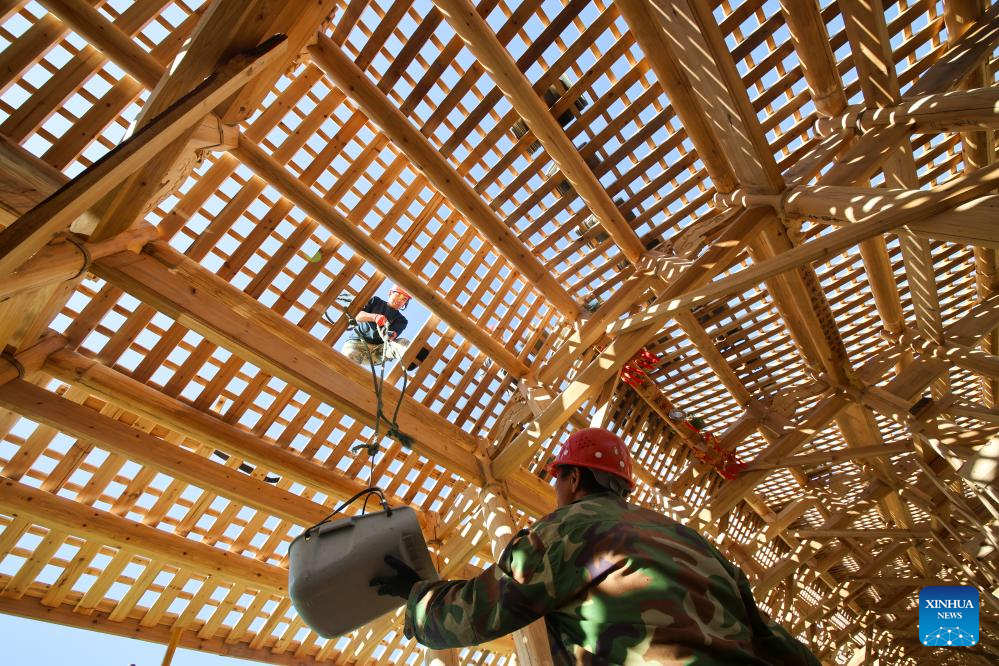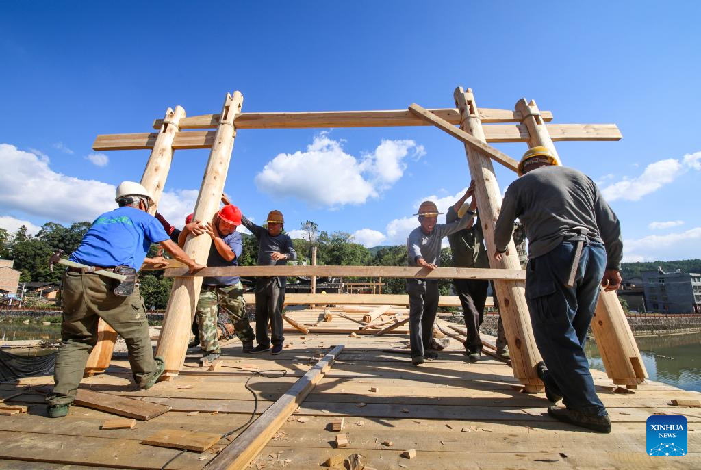 Workers work on the restoration of the Wan'an Bridge, a wooden arch bridge, in Changqiao Township of Pingnan County, southeast China's Fujian Province, Nov. 2, 2023.?(Photo by Wang Zhiling/Xinhua)