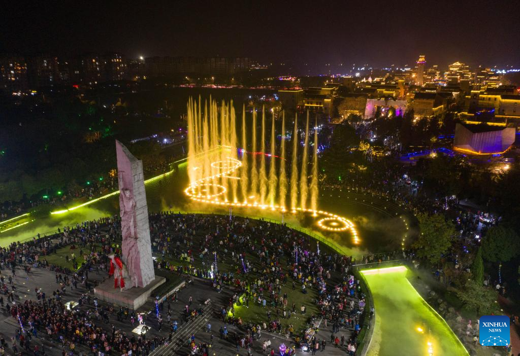 An aerial drone photo taken on Nov. 14, 2020 shows people watching a music fountain show during Qiang New Year festival holiday at a square in Beichuan Qiang Autonomous County, southwest China's Sichuan Province.?(Xinhua/Jiang Hongjing)