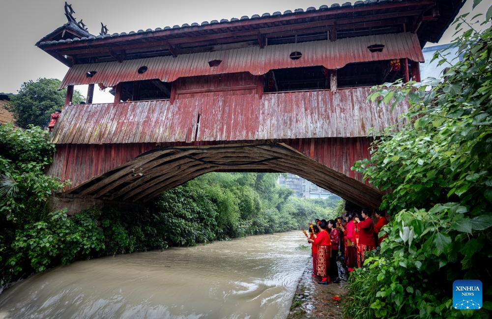 Villagers participate in a traditional folk activity of the Duanwu Festival, or the Dragon Boat Festival, at Shuangmen Bridge, a wooden arch bridge, in Qingyuan County of Lishui City, east China's Zhejiang Province, June 11, 2024.?(Photo by Wu Chunping/Xinhua)