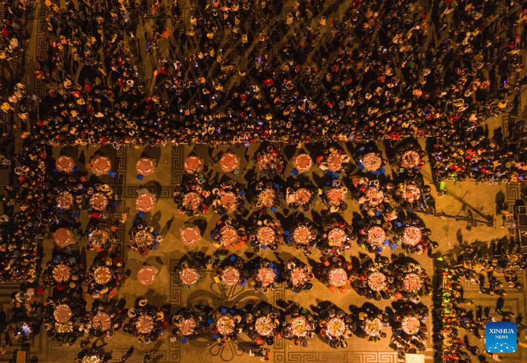 An aerial drone photo taken on Nov. 14, 2020 shows residents attending a group banquet at a square in Beichuan Qiang Autonomous County, southwest China's Sichuan Province.?(Xinhua/Jiang Hongjing)