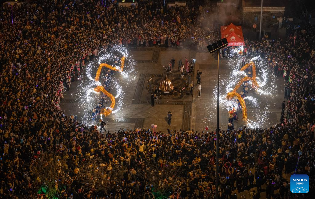 Local people perform dragon dance to celebrate Qiang New Year festival at a square in Beichuan Qiang Autonomous County, southwest China's Sichuan Province, Nov. 14, 2020.?(Xinhua/Jiang Hongjing)