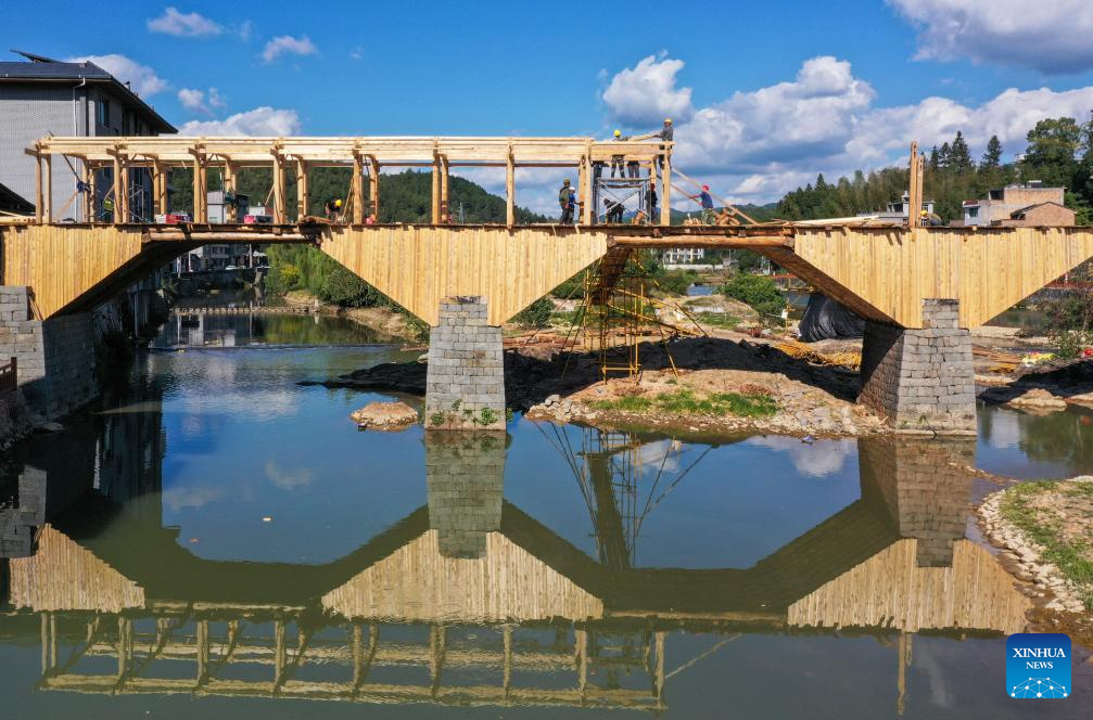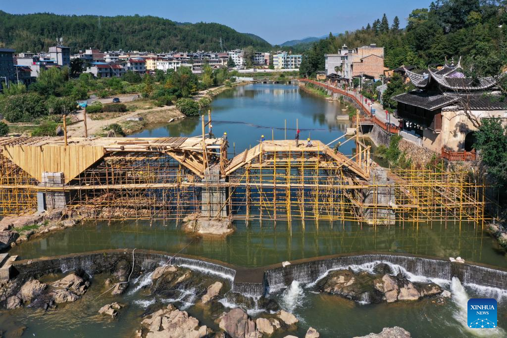 A drone photo taken on Oct. 18, 2023 shows workers working on the restoration of the Wan'an Bridge, a wooden arch bridge, in Changqiao Township of Pingnan County, southeast China's Fujian Province.?(Photo by Wang Zhiling/Xinhua)