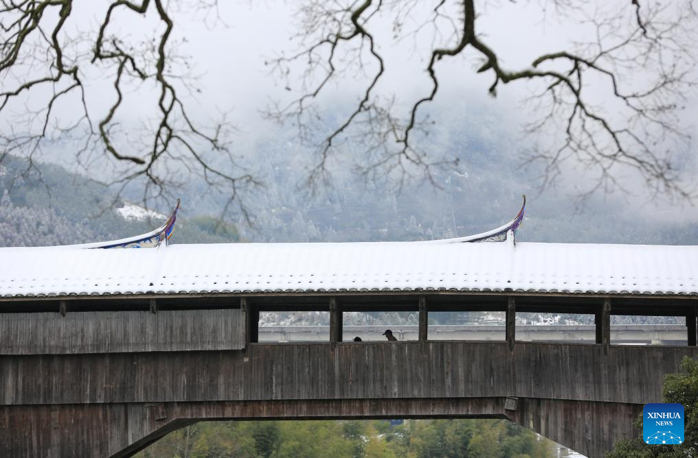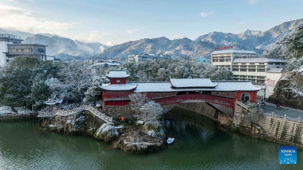 An aerial drone photo taken on Jan. 23, 2024 shows the Yonggui Bridge, a wooden arch bridge, after snowfall in Qingyuan County of Lishui City, east China's Zhejiang Province.?(Photo by Wu Chunping/Xinhua)