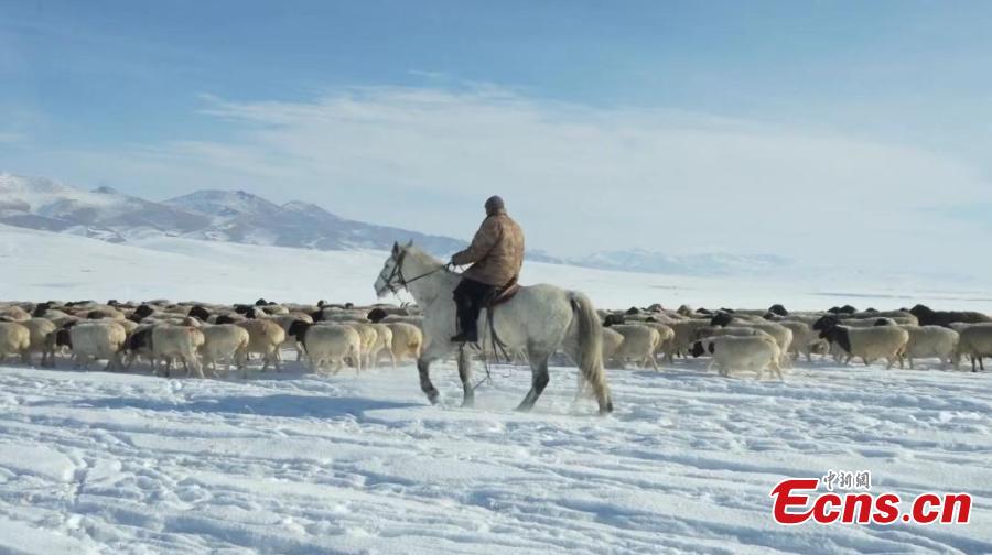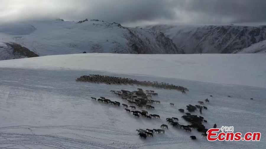 Herders drive livestock on the way to winter pastures on Bayanbulak Grassland in Hejing County, northwest China's Xinjiang Uygur Autonomous Region. (China News Service/Gao Naqing)