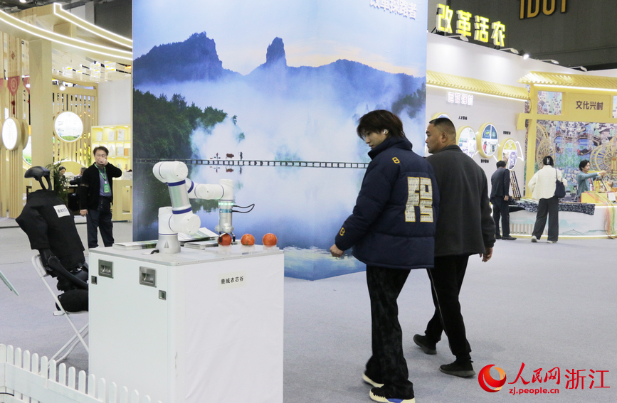 Visitors watch a sorting robot during the 2024 Zhejiang Agricultural Fair, held in Hangzhou, east China's Zhejiang Province. (People's Daily Online/Wang Liwei)