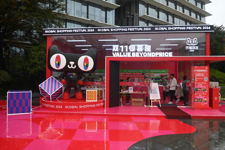This photo taken on Nov. 1, 2024 shows an outdoor installation featuring "Double 11" shopping festival at Alibaba Group's Xixi Park in Hangzhou, east China's Zhejiang Province. (Xinhua/Huang Zongzhi)