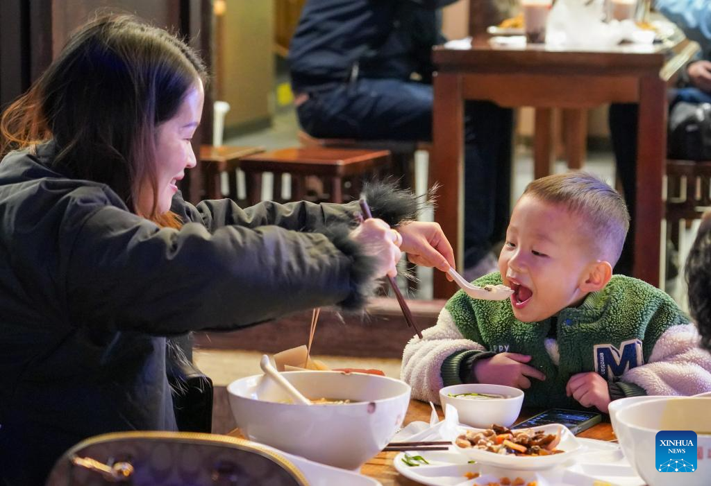 Tourists have rice noodles at a restaurant on a street at night in Kunming City, southwest China's Yunnan Province, Dec. 6, 2024. In recent years, Kunming has stepped up its efforts to enrich citizen's life by developing night fair compounds. (Xinhua/Wang Jingyi)