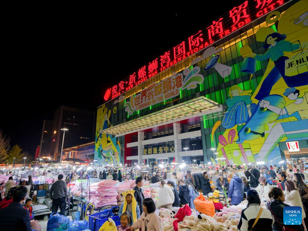 Tourists select clothes on a street at night in Kunming City, southwest China's Yunnan Province, Dec. 6, 2024. In recent years, Kunming has stepped up its efforts to enrich citizen's life by developing night fair compounds. (Xinhua/Wang Jingyi)