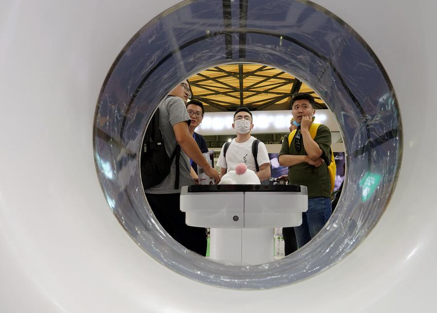 A CT scanner specially designed for animal is pictured at the 25th Pet Fair Asia in east China's Shanghai, Aug. 16, 2023. (Xinhua/Liu Ying)