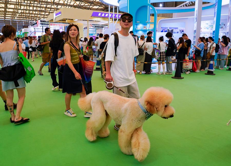 A visitor walks his dog at the 25th Pet Fair Asia in east China's Shanghai, Aug. 18, 2023. (Photo by Li Xinyi/Xinhua)