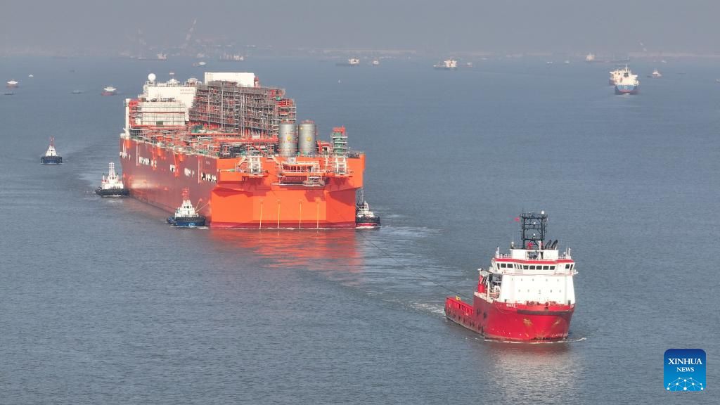 This aerial drone photo taken on Dec. 9, 2024 shows the "NGUYA FLNG," a floating liquified natural gas (FLNG) facility, being tugged in the Taicang section of the Yangtze River in east China's Jiangsu Province. The "NGUYA FLNG," the first large-scale FLNG facility made in the country, was transferred from Nantong of Jiangsu to Zhoushan of Zhejiang (both in east China), where it will be further assembled, integrated and modulated.