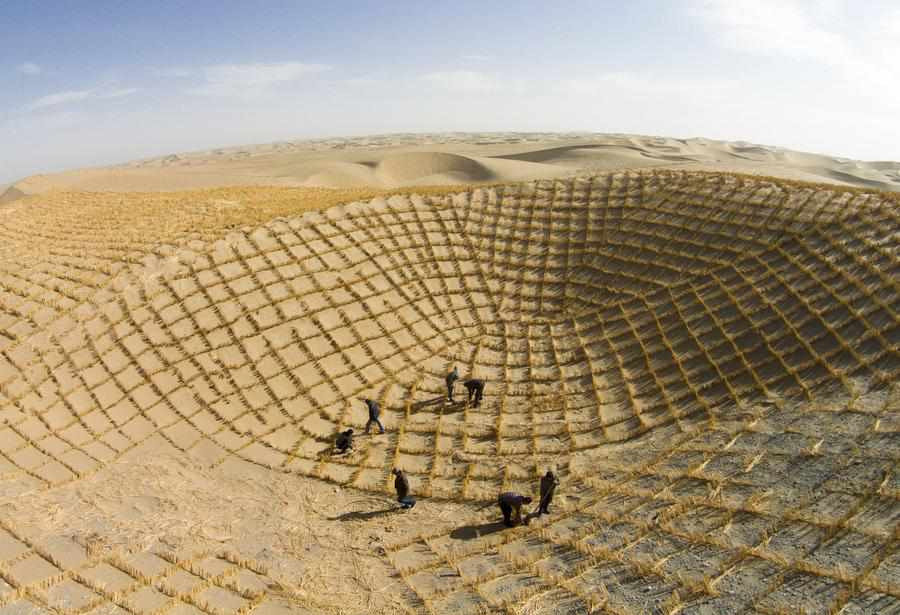 According to Zhang Peiji, deputy director of Pishan's forestry and grassland bureau, the sand dunes in an area of the county are widely spaced and ordinary straw checkerboards -- where straw is placed in a checkerboard pattern on the desert surface to fix the dunes -- are easily buried by the shifting sand.