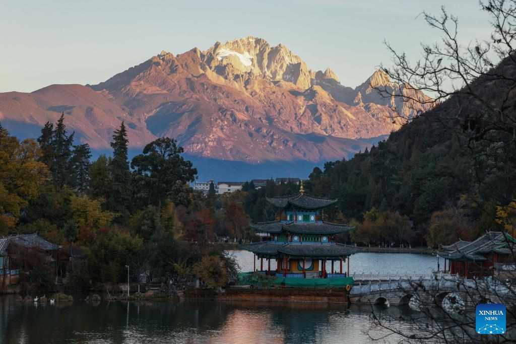 This photo taken from Heilongtan Park shows sunlight shining on the Yulong Snow Mountain in Lijiang City, southwest China's Yunnan Province, Dec. 9, 2024. (Xinhua/Meng Tao)