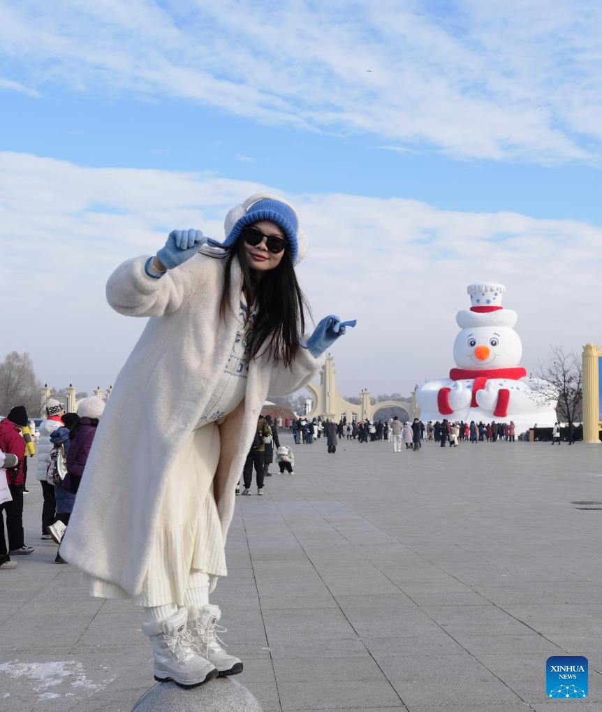 A visitor poses for photos with a giant snowman at the entrance square of the Sun Island scenic spot in Harbin, capital of northeast China's Heilongjiang Province, Dec. 9, 2024.