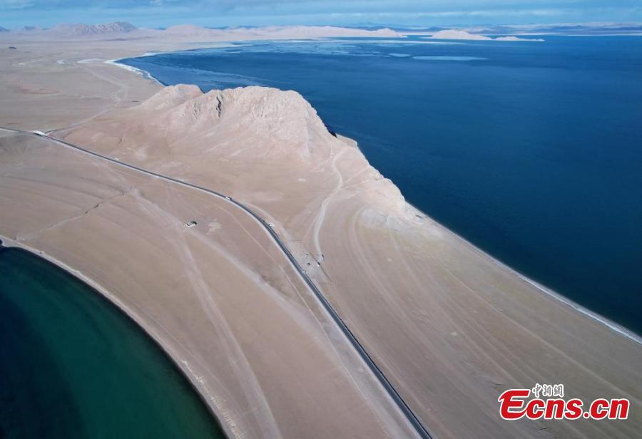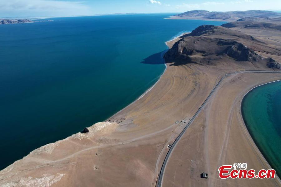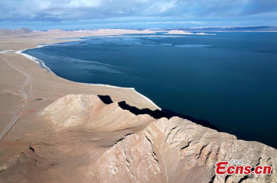 Aerial view of Serling Tso Lake in winter in Nagqu, southwest China's Xizang Autonomous Region, Dec. 9, 2024. (China News Service/Li Lin)