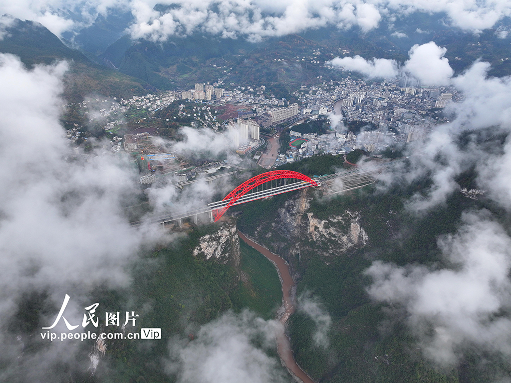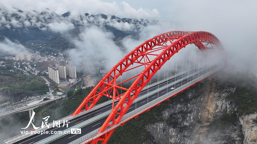 Loushuihe Bridge in Hefeng county, Enshi Tujia and Miao Autonomous Prefecture, central China's Hubei Province, was enveloped in mist, presenting a magnificent scene on Dec. 5, 2024.