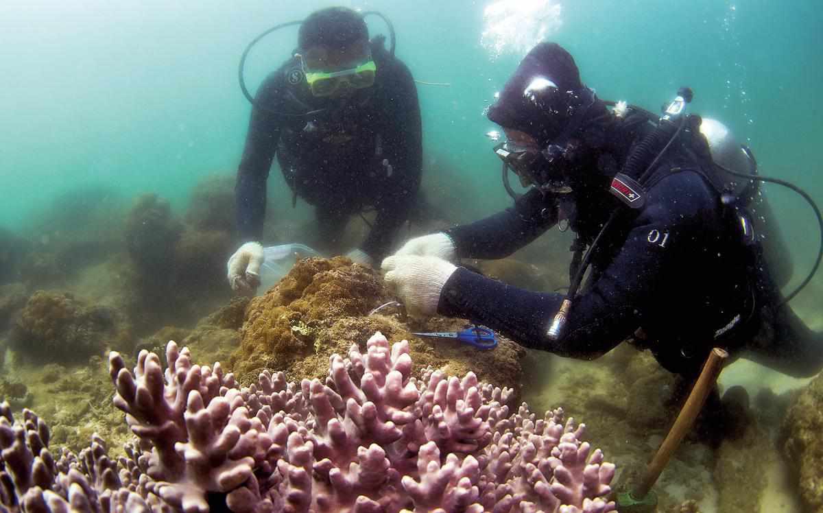 Wang Fengguo (right) and a fellow diver transplant corals at the ranch in May last year. (Yang Guanyu/Xinhua)