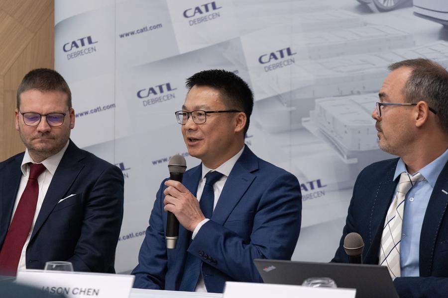 Jason Chen (C), general manager of CATL Europe Operations, speaks at a press conference in Debrecen, Hungary, on Nov. 20, 2024. China's leading battery maker, Contemporary Amperex Technology Co., Ltd. (CATL), announced that it will start producing battery cells at its new facility in Hungary's second-largest city Debrecen next year. (Photo by Attila Volgyi/Xinhua)