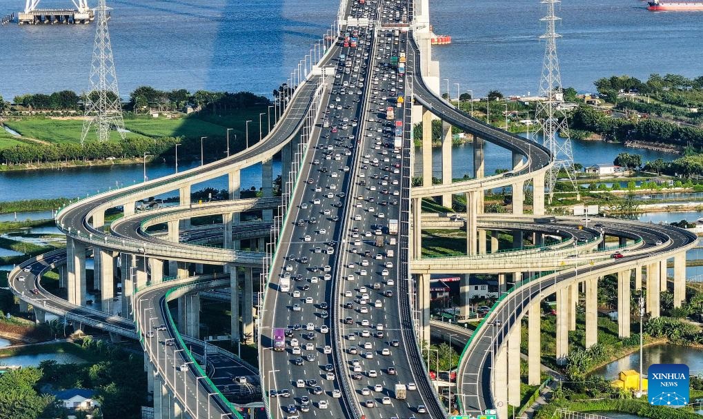 An aerial drone photo taken on Oct. 2, 2024 shows a view of an interchange overpass on the Nansha Bridge, which links Guangzhou City and Dongguan City, in Haiou Island of the Pearl River Estuary area in Guangzhou, south China's Guangdong Province. In recent years, the construction of cross-river and cross-sea passages in the Guangdong-Hong Kong-Macao Greater Bay Area has developed rapidly. The passage networks play a significant role in building and improving the comprehensive three-dimensional transportation network in the Greater Bay Area, as well as promoting deeper integration and development in the region. (Xinhua/Liu Dawei)