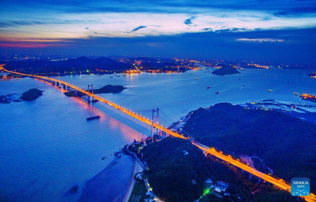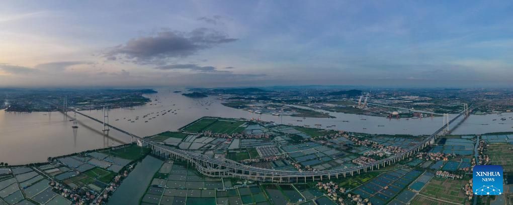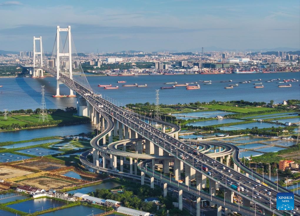 An aerial drone photo taken on June 29, 2022 shows a view of the Nansha Bridge, which links Guangzhou City and Dongguan City in south China's Guangdong Province. In recent years, the construction of cross-river and cross-sea passages in the Guangdong-Hong Kong-Macao Greater Bay Area has developed rapidly. The passage networks play a significant role in building and improving the comprehensive three-dimensional transportation network in the Greater Bay Area, as well as promoting deeper integration and development in the region. (Xinhua/Liu Dawei)