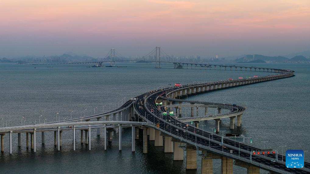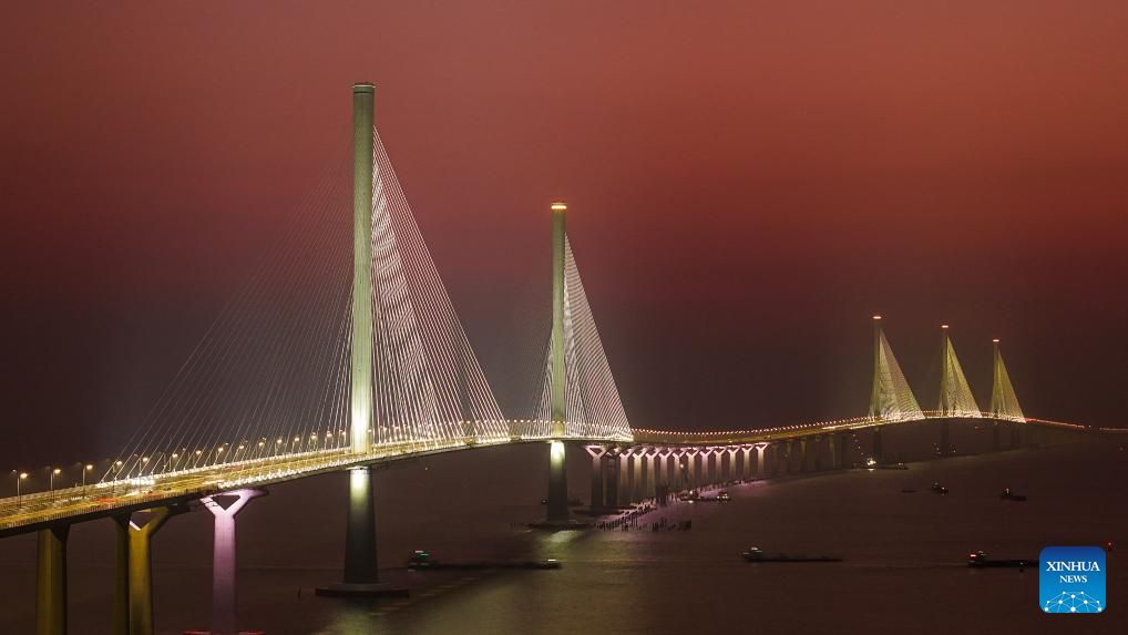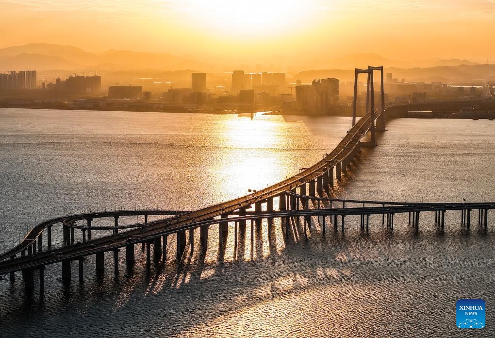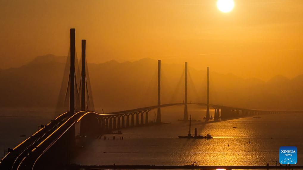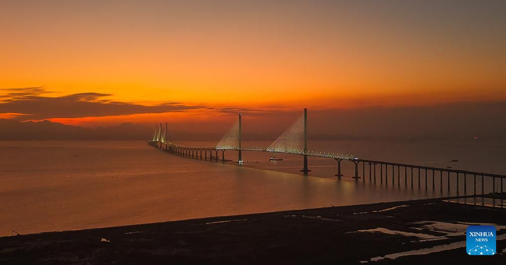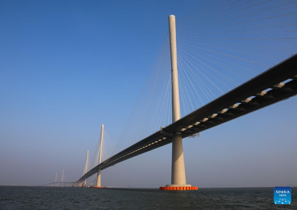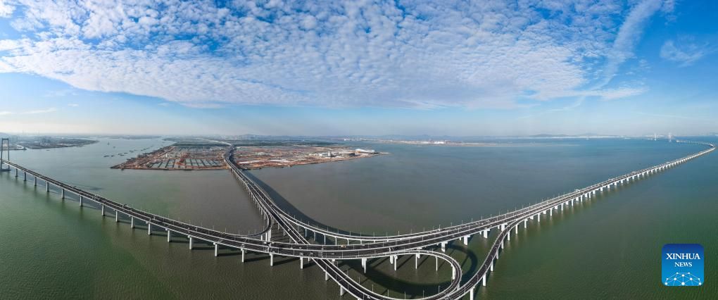 This photo taken on Dec. 7, 2024 shows a view of Gaolan Port Bridge (with twin main towers on the left) and Huangmao Sea Channel Bridge (with three main towers on the right) in south China's Guangdong Province. In recent years, the construction of cross-river and cross-sea passages in the Guangdong-Hong Kong-Macao Greater Bay Area has developed rapidly. The passage networks play a significant role in building and improving the comprehensive three-dimensional transportation network in the Greater Bay Area, as well as promoting deeper integration and development in the region. (Xinhua/Liu Dawei)