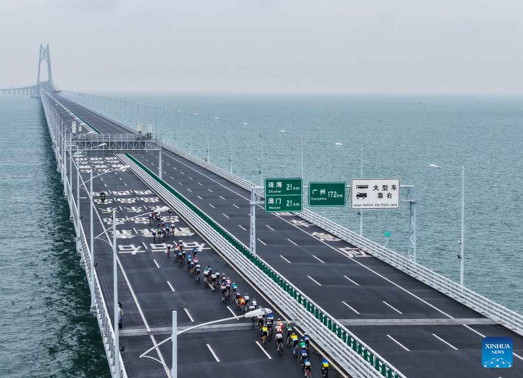 An aerial drone photo taken on Nov. 24, 2024 shows athletes participating in a cycling race passing through the Hong Kong-Zhuhai-Macao Bridge in south China. In recent years, the construction of cross-river and cross-sea passages in the Guangdong-Hong Kong-Macao Greater Bay Area has developed rapidly. The passage networks play a significant role in building and improving the comprehensive three-dimensional transportation network in the Greater Bay Area, as well as promoting deeper integration and development in the region. (Xinhua/Liu Dawei)
