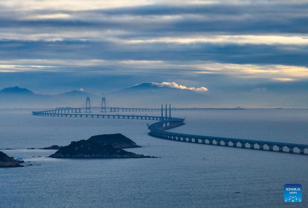 An aerial drone photo taken on Dec. 15, 2023 shows a view of the Hong Kong-Zhuhai-Macao Bridge in south China. In recent years, the construction of cross-river and cross-sea passages in the Guangdong-Hong Kong-Macao Greater Bay Area has developed rapidly. The passage networks play a significant role in building and improving the comprehensive three-dimensional transportation network in the Greater Bay Area, as well as promoting deeper integration and development in the region. (Xinhua/Liu Dawei)