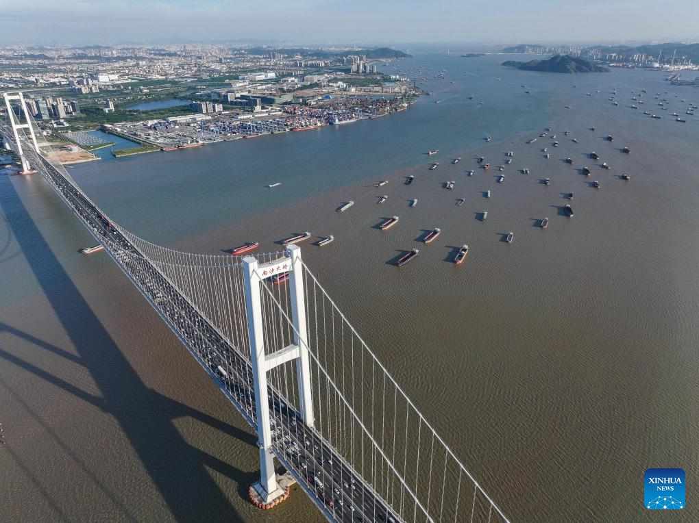 An aerial drone photo taken on Oct. 2, 2024 shows a view of the Nansha Bridge, which links Guangzhou City and Dongguan City, and ships along the Shiziyang channel in the Pearl River Estuary area, in south China's Guangdong Province. In recent years, the construction of cross-river and cross-sea passages in the Guangdong-Hong Kong-Macao Greater Bay Area has developed rapidly. The passage networks play a significant role in building and improving the comprehensive three-dimensional transportation network in the Greater Bay Area, as well as promoting deeper integration and development in the region. (Xinhua/Liu Dawei)