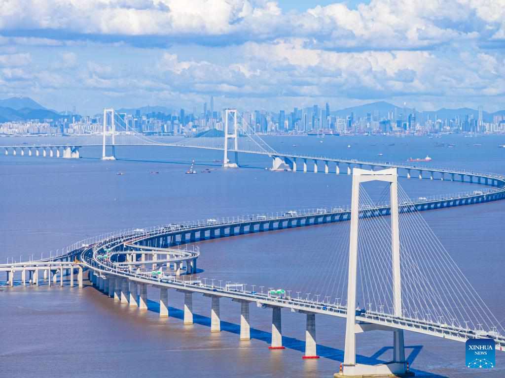 An aerial drone photo taken on July 3, 2024 shows vehicles running on the Shenzhen-Zhongshan link in south China's Guangdong Province. In recent years, the construction of cross-river and cross-sea passages in the Guangdong-Hong Kong-Macao Greater Bay Area has developed rapidly. The passage networks play a significant role in building and improving the comprehensive three-dimensional transportation network in the Greater Bay Area, as well as promoting deeper integration and development in the region. (Xinhua/Mao Siqian)