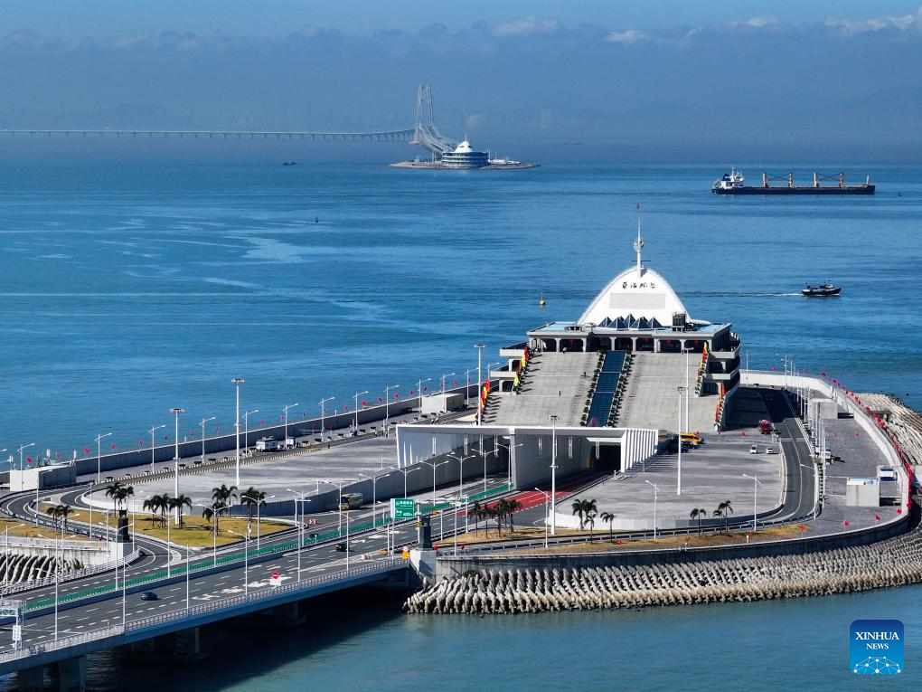 An aerial drone photo taken on Dec. 15, 2023 shows the eastern artificial island and western artificial island of the Hong Kong-Zhuhai-Macao Bridge in south China. In recent years, the construction of cross-river and cross-sea passages in the Guangdong-Hong Kong-Macao Greater Bay Area has developed rapidly. The passage networks play a significant role in building and improving the comprehensive three-dimensional transportation network in the Greater Bay Area, as well as promoting deeper integration and development in the region. (Xinhua/Liu Dawei)