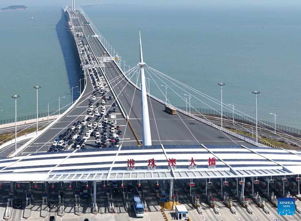 An aerial drone photo taken on Feb. 12, 2024 shows vehicles on the Hong Kong-Zhuhai-Macao Bridge in south China. In recent years, the construction of cross-river and cross-sea passages in the Guangdong-Hong Kong-Macao Greater Bay Area has developed rapidly. The passage networks play a significant role in building and improving the comprehensive three-dimensional transportation network in the Greater Bay Area, as well as promoting deeper integration and development in the region. (Xinhua)