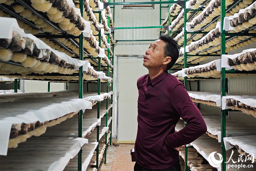 A farmer checks on the growth of tremella mushrooms in a greenhouse in Gutian county, Ningde city, southeast China's Fujian Province. (People's Daily Online/Huang Dongyi)