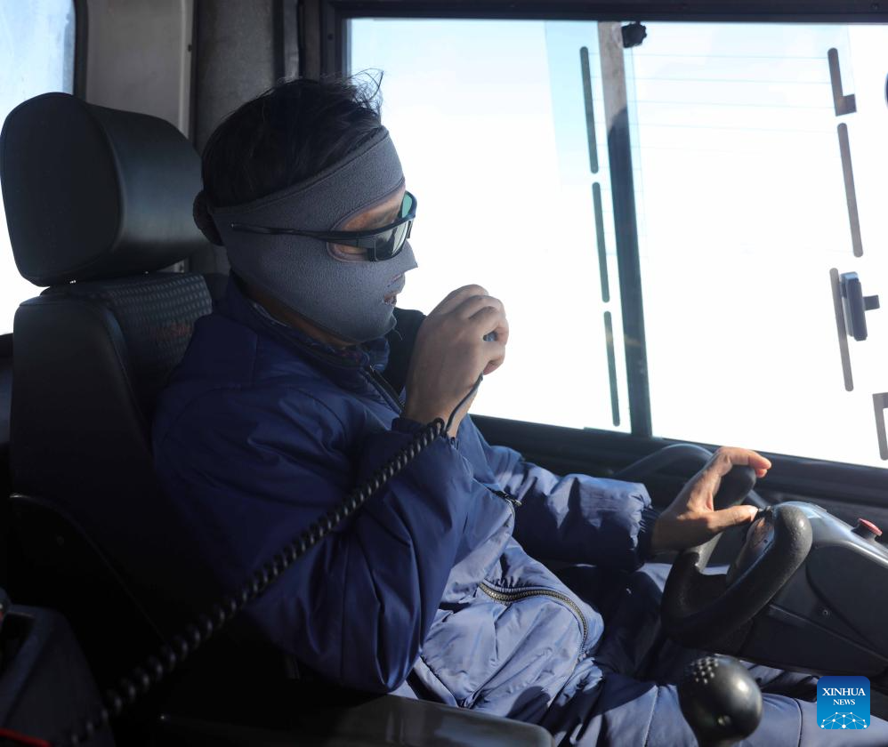 A member of China's 41st Antarctic expedition team drives snowmobile to transport supplies to China's Zhongshan station in Antarctica, Dec. 3, 2024. Currently on China's 41st Antarctic expedition, research icebreakers Xuelong and Xuelong 2, or Snow Dragon and Snow Dragon 2, carried out unloading operations surrounding Zhongshan Station, a Chinese research base in Antarctica. (Xinhua/Huang Taoming)