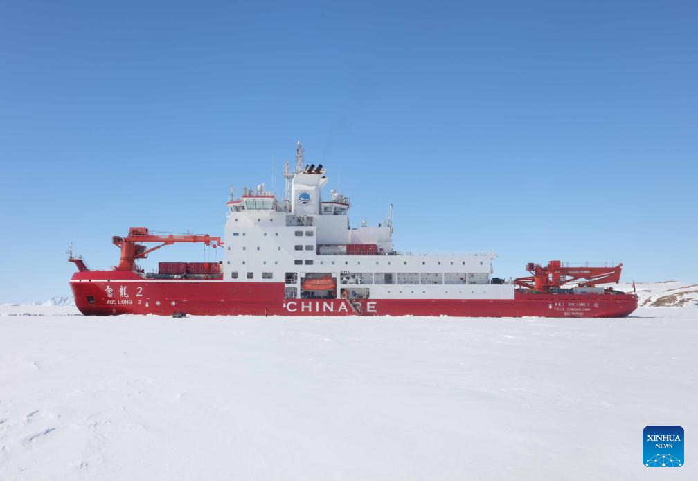 China's research icebreaker Xuelong 2 waits for the unloading operations in Antarctica, Dec. 3, 2024. Currently on China's 41st Antarctic expedition, research icebreakers Xuelong and Xuelong 2, or Snow Dragon and Snow Dragon 2, carried out unloading operations surrounding Zhongshan Station, a Chinese research base in Antarctica. (Xinhua/Huang Taoming)