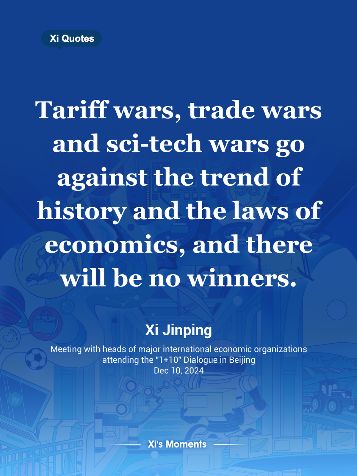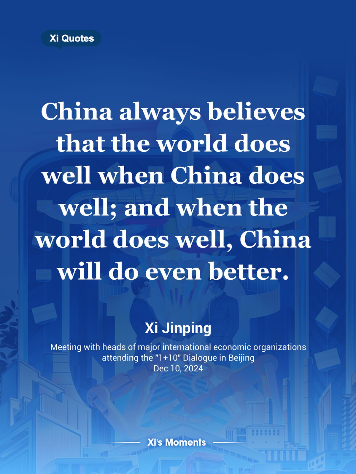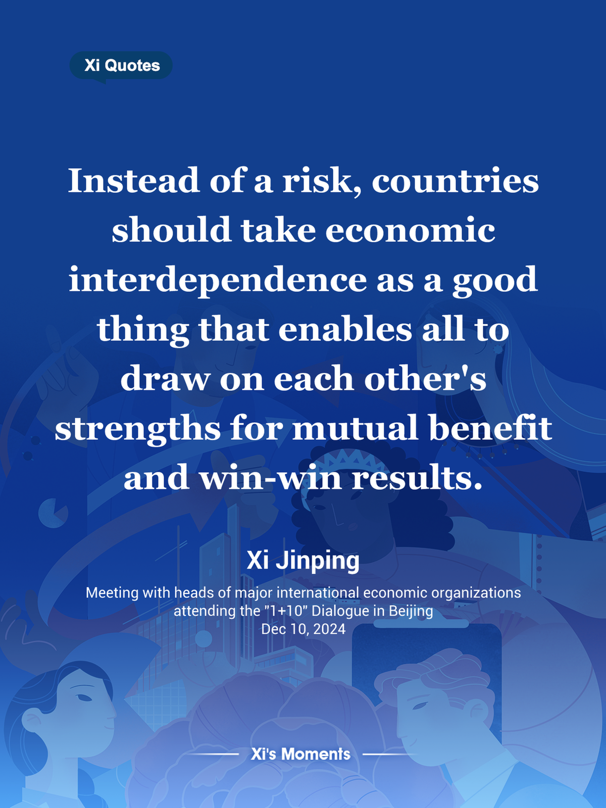 Meeting with heads of major international economic organizations in Beijing on Tuesday, President Xi Jinping stressed again the importance of building an open world economy through cooperation. Here are some highlights of his remarks.