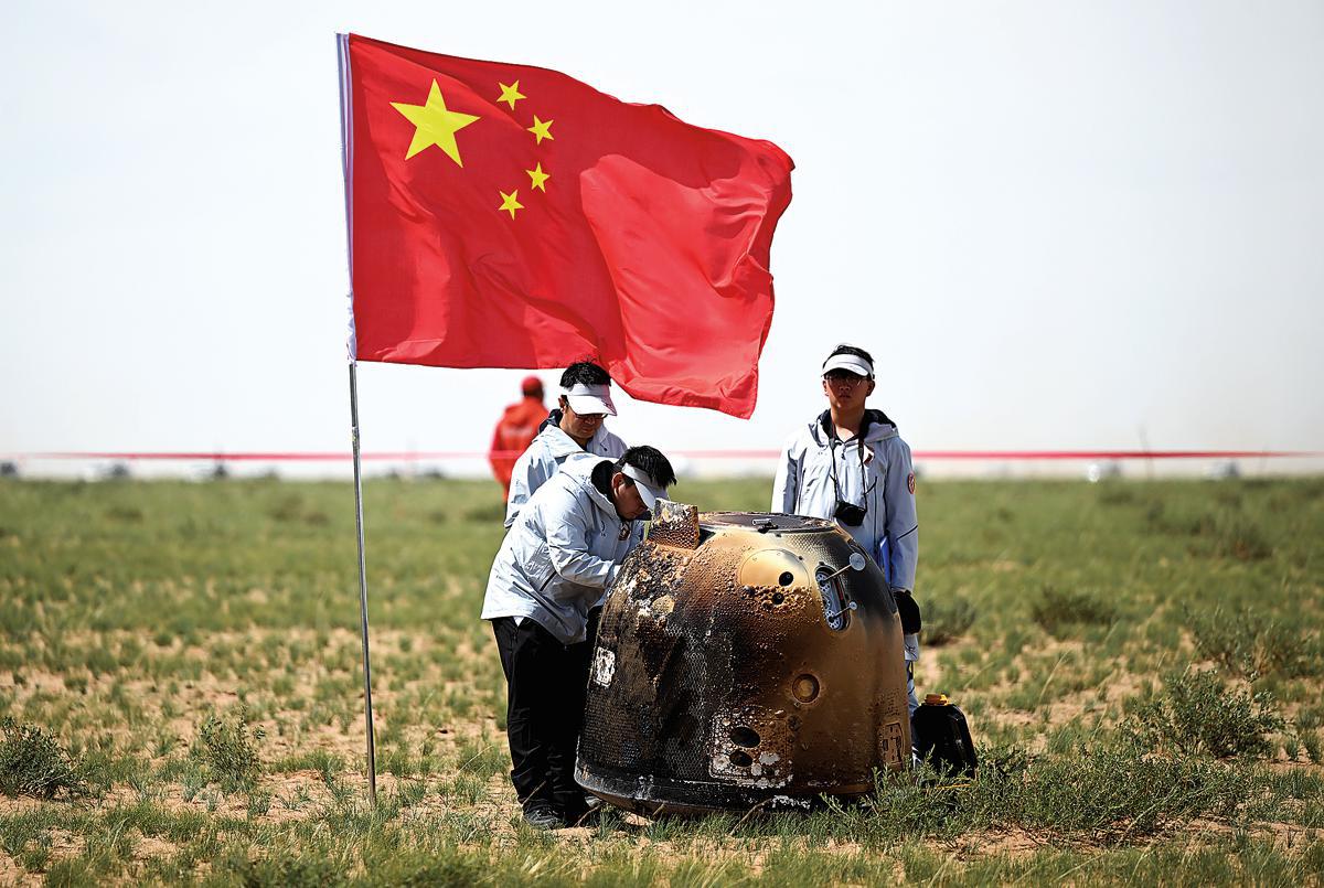 The returner of the Chang'e 6 mission, containing lunar soil samples, successfully lands in Siziwang Banner, Inner Mongolia autonomous region, on June 25. (Photo/Xinhua)