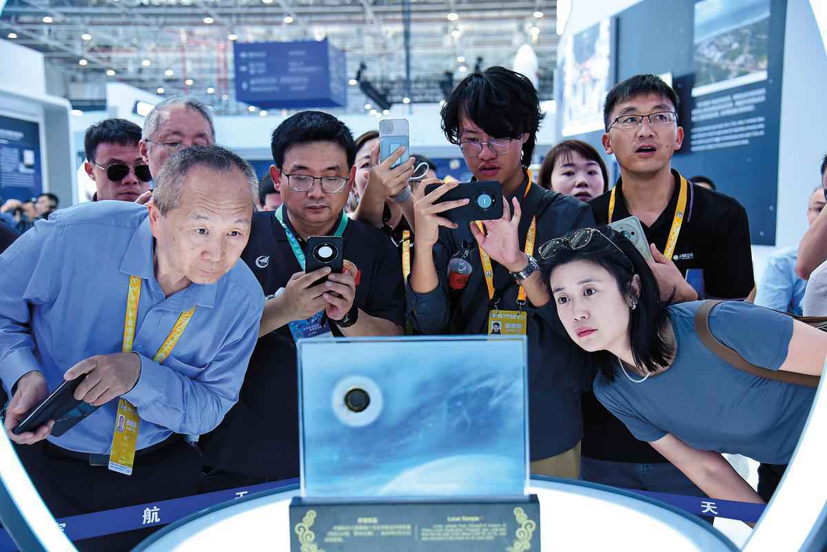 Spectators observe the retrieval of a lunar soil sample on the Chang'e 6 mission, displayed at the 15th China International Aviation and Aerospace Exhibition in Zhuhai, Guangdong province, last month. (Hong Zehua/Xinhua)