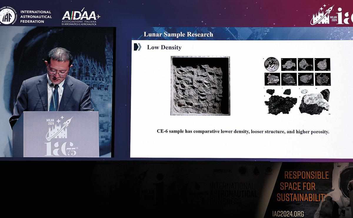 Guan Feng, director of the Lunar Exploration and Space Engineering Center of the China National Space Administration, introduces the Chang'e 6 mission and research development associated with the lunar soil sample the mission had retrieved from the far side of the moon during the 75th International Astronautical Congress in Milan, Italy, in October. (Photo/China News Service)