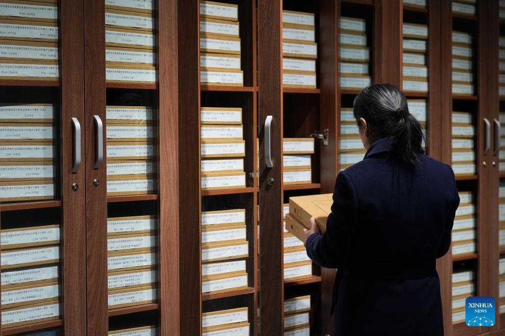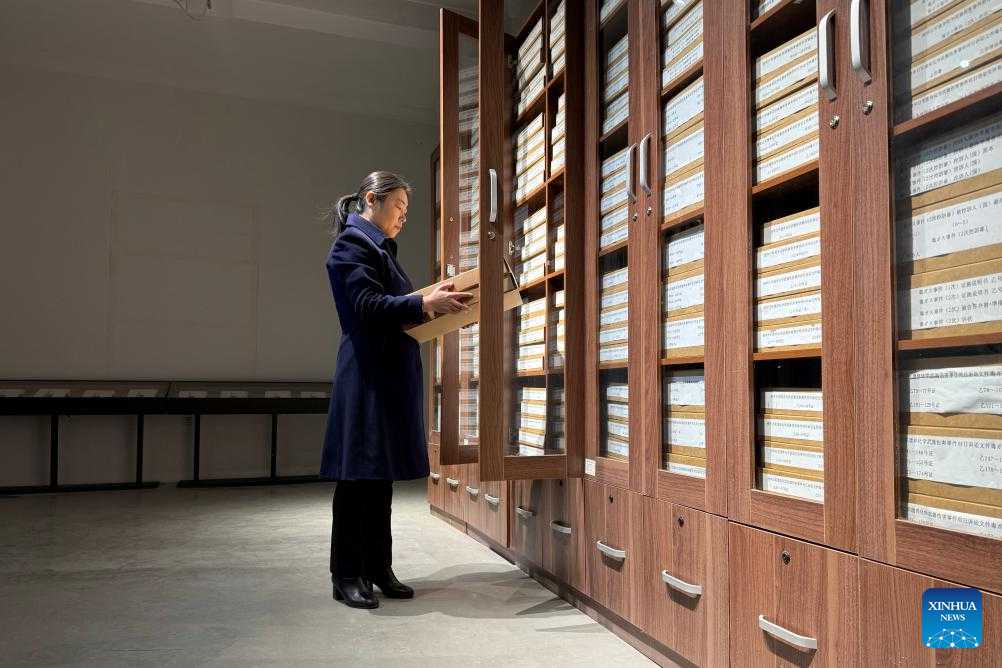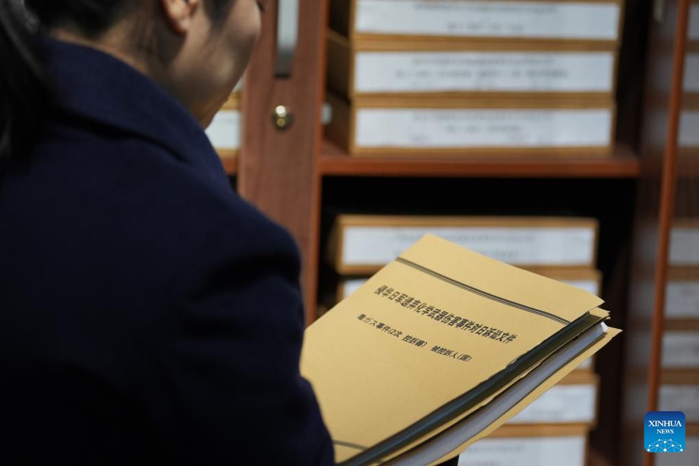 A researcher of the Exhibition Hall of Evidences of Crime Committed by Unit 731 of the Japanese Imperial Army arranges archives at the former site of Unit 731 in Harbin, northeast China's Heilongjiang Province, Dec. 12, 2024. The former site of the notorious Japanese germ warfare army, known as Unit 731, reopened to public on Friday with a special exhibition on cultural relics and historical materials of Japan's germ-warfare crimes in China.