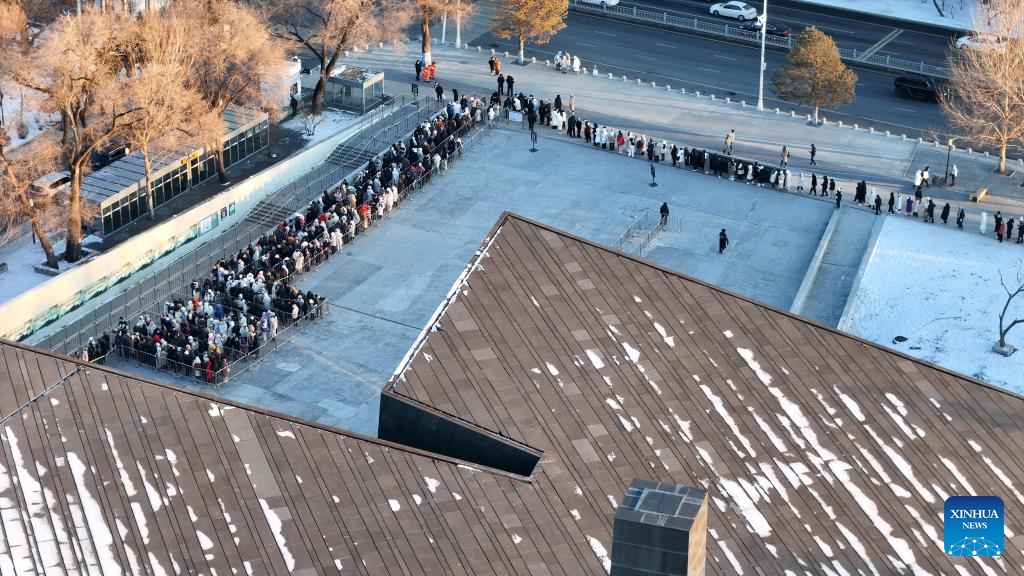 An aerial drone photo taken on Dec. 12, 2024 shows people lining up to enter the Exhibition Hall of Evidences of Crime Committed by Unit 731 of the Japanese Imperial Army in Harbin, northeast China's Heilongjiang Province. The former site of the notorious Japanese germ warfare army, known as Unit 731, reopened to public on Friday with a special exhibition on cultural relics and historical materials of Japan's germ-warfare crimes in China.