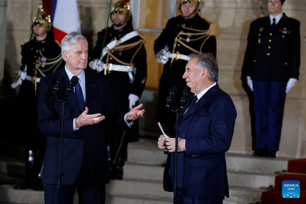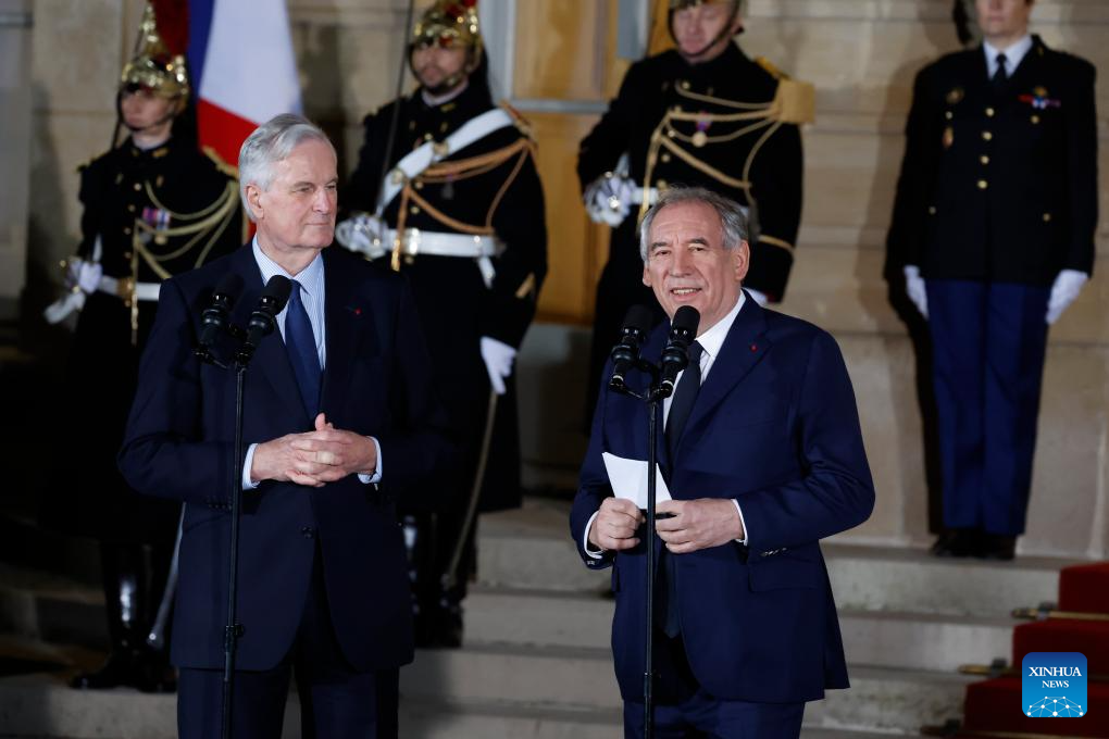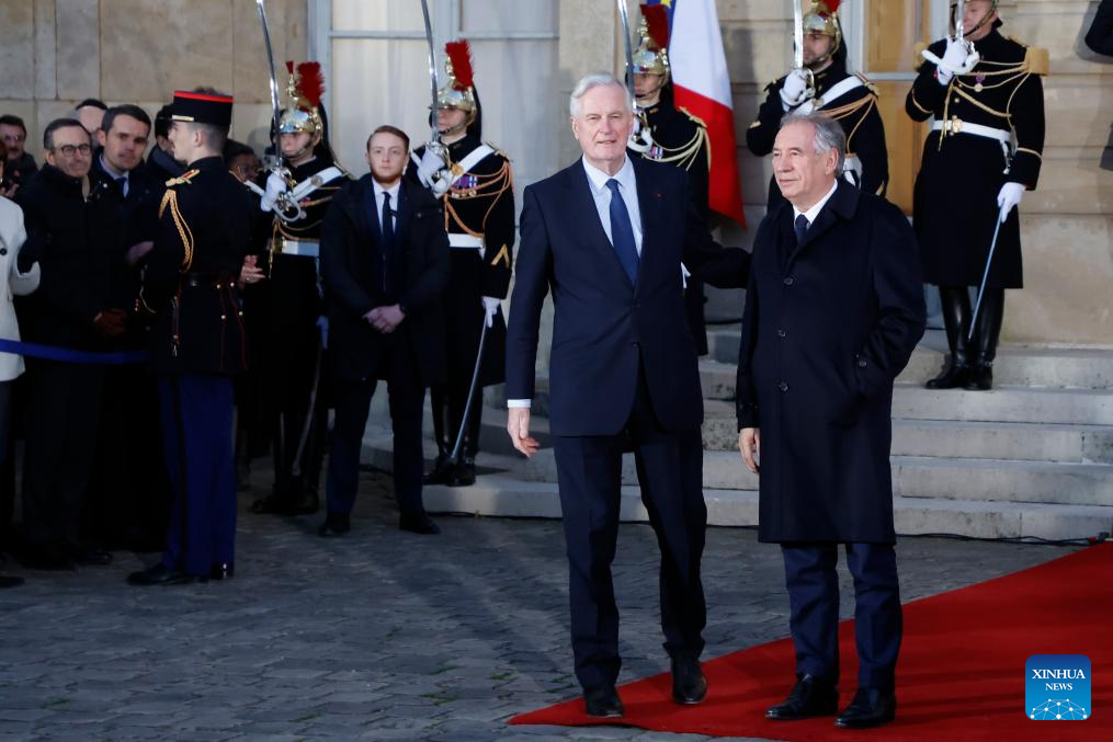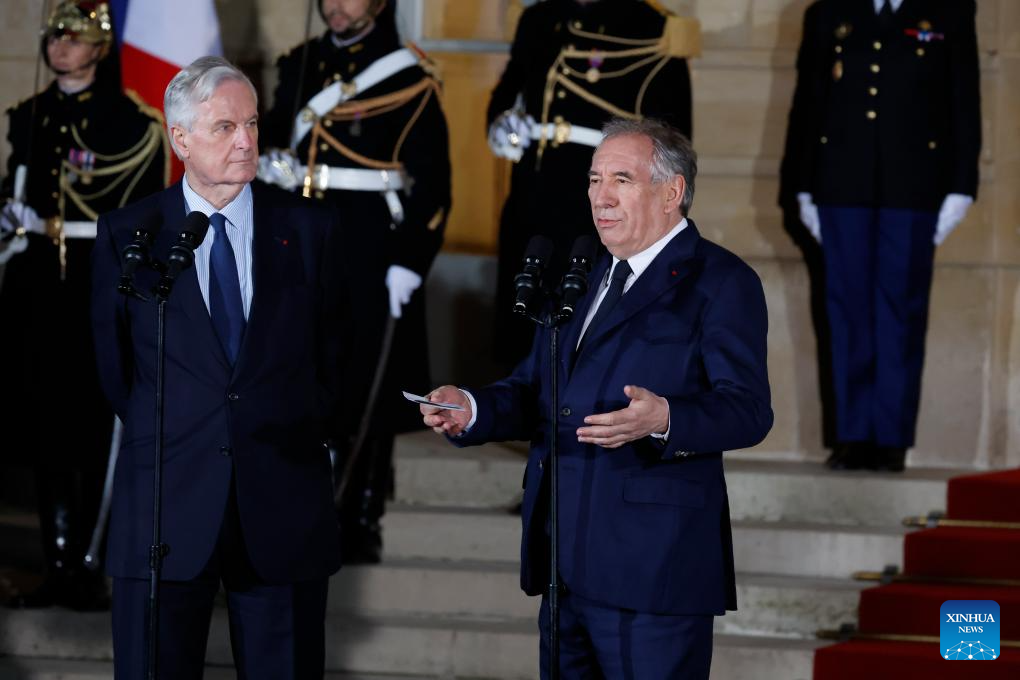 Francois Bayrou (R, Front) and outgoing French Prime Minister Michel Barnier (L, Front) attend the transfer of power ceremony in Paris, France, on Dec. 13, 2024. French President Emmanuel Macron on Friday nominated Francois Bayrou as the country's new prime minister, succeeding Michel Barnier, who was ousted in a vote of no confidence on Dec. 4. (Photo by Henri Szwarc/Xinhua)
