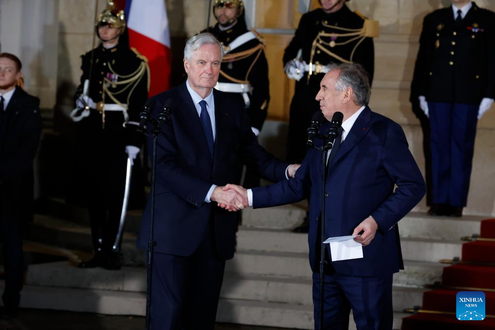 Francois Bayrou (R, Front) shakes hands with outgoing French Prime Minister Michel Barnier (L, Front) at the transfer of power ceremony in Paris, France, on Dec. 13, 2024. French President Emmanuel Macron on Friday nominated Francois Bayrou as the country's new prime minister, succeeding Michel Barnier, who was ousted in a vote of no confidence on Dec. 4. (Photo by Henri Szwarc/Xinhua)