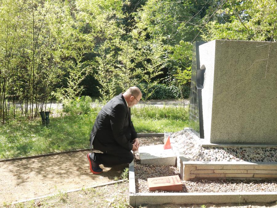 Christoph Reinhardt, the great-grandson of John Rabe, mourns at the tomb of John Rabe in Berlin, Germany, July 6, 2024. (Xinhua/Li Hanlin)