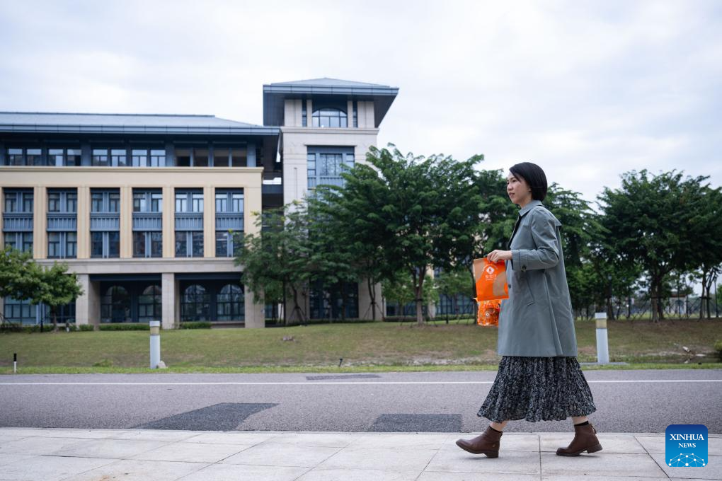 Su Baijing, wife of Wong Chi Choi, a young man from Macao, walks in the Hengqin Campus of the University of Macao, in Hengqin of Zhuhai city, south China's Guangdong Province, Dec. 11, 2024. (Xinhua/Cheong Kam Ka)
