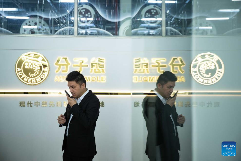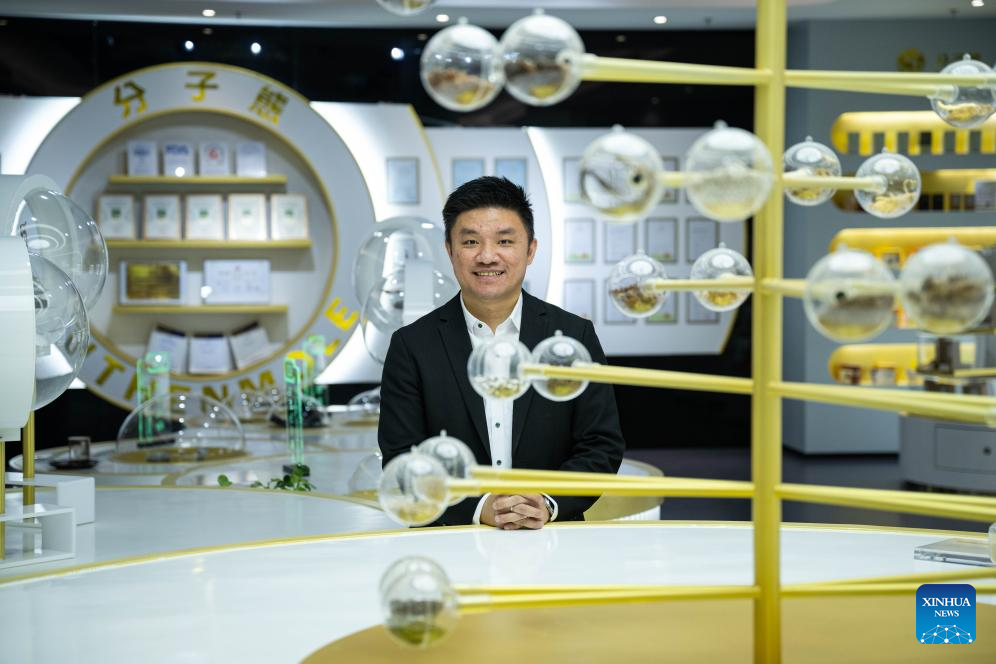 Wong Chi Choi, a young man from Macao, looks on in an exhibition hall of Authenmole (Hengqin Zhuhai) Traditional Chinese Medicine Health Industry Development Co., Ltd. he works in, in Hengqin of Zhuhai city, south China's Guangdong Province, Dec. 11, 2024. (Xinhua/Cheong Kam Ka)